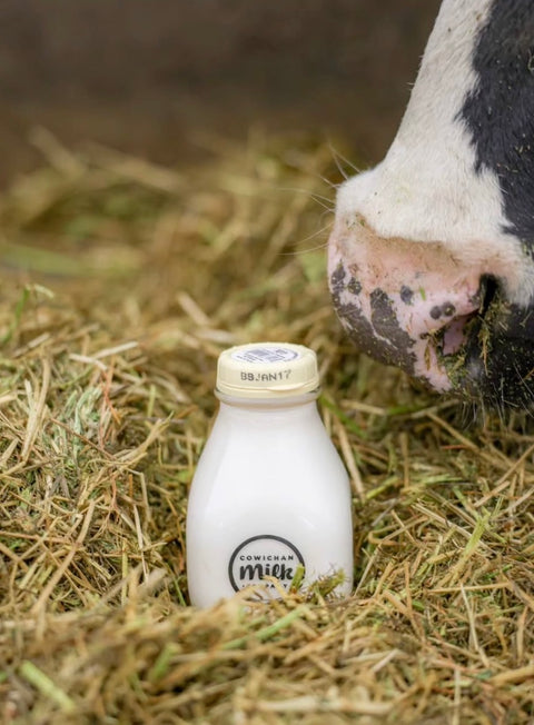 Cowichan Milk Company is a true Vancouver Island family farm. All of their milk is produced by their 55 grass fed Holstein cows on their farm in the Cowichan Valley. Cowichan Milk Company grows all their own grass to feed their cows year-round with some purchased grain and alfalfa.